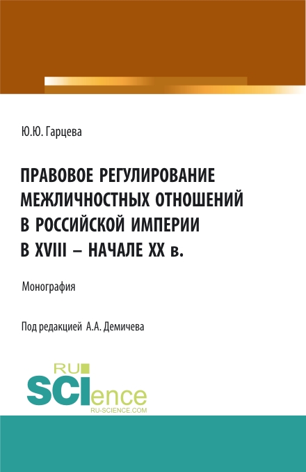 Гарцева, Ю. Ю. Правовое регулирование межличностных отношений в Российской империи в XVIII - начале XX в. : монография / Ю. Ю. Гарцева, ; под ред. А. А. Демичева.