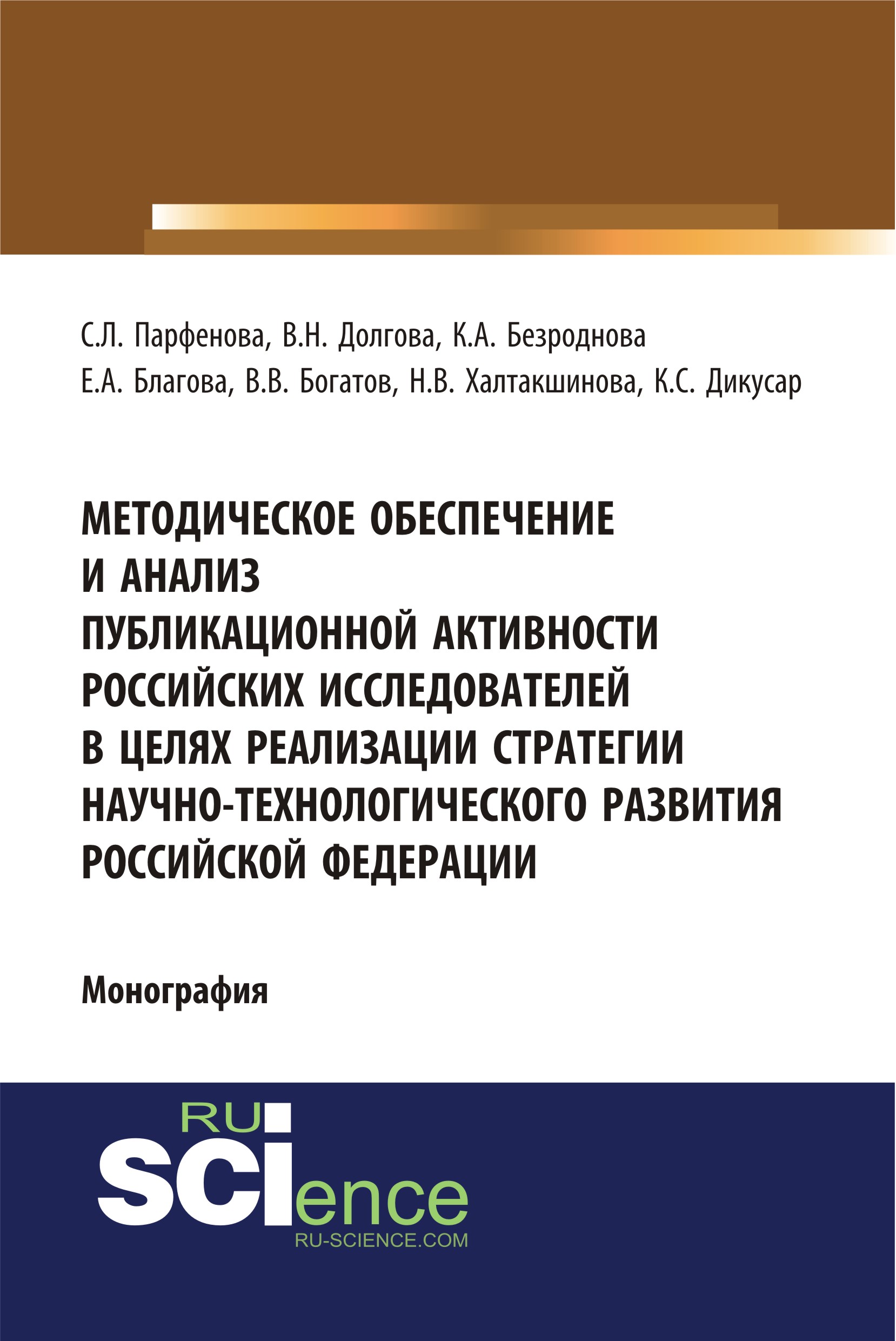 Методическое обеспечение и анализ публикационной активности российских исследователей в целях реализации стратегии научно-технологического развития Российской Федерации : монография / С. Л. Парфенова, В. Н. Долгова, К. А. Безроднова [и др.].